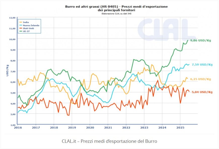 La decelerazione dell’export europeo trova spiegazione nella dinamica dei prezzi, con le quotazioni continentali che risultano significativamente superiori rispetto ai competitor internazionali. I dati più recenti relativi alle esportazioni globali mostrano un prezzo medio UE di 9,86 $/Kg, che supera nettamente quello di altri grandi produttori mondiali come la Nuova Zelanda (7,59 $/Kg), che mantiene la leadership nel settore, oltre ad altri attori emergenti quali l’India (6,25 $/Kg) e gli Stati Uniti (5,04 $/Kg).