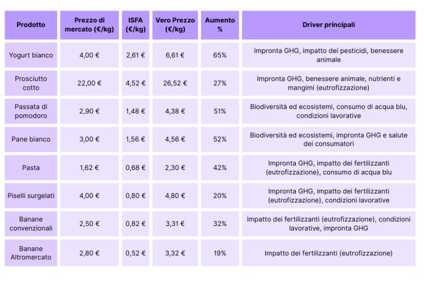 INDAGINI E RICERCHE – Il prezzo che i consumatori pagano alla cassa rappresenta solo una frazione del costo reale degli alimenti. Lo yogurt, ad esempio, costa effettivamente 6,61 euro al chilo anziché i 4 euro indicati in etichetta: il 65% in più che viene sostenuto dalla collettività attraverso spese sanitarie, degrado del suolo e perdita di biodiversità. Anche prodotti simbolo della tradizione italiana mostrano significativi costi nascosti: la pasta presenta un sovracosto di 0,68 euro al chilo (+42%), mentre la passata di pomodoro – eccellenza del Made in Italy – raggiunge 1,48 euro al chilo (+51%) principalmente a causa del consumo idrico.