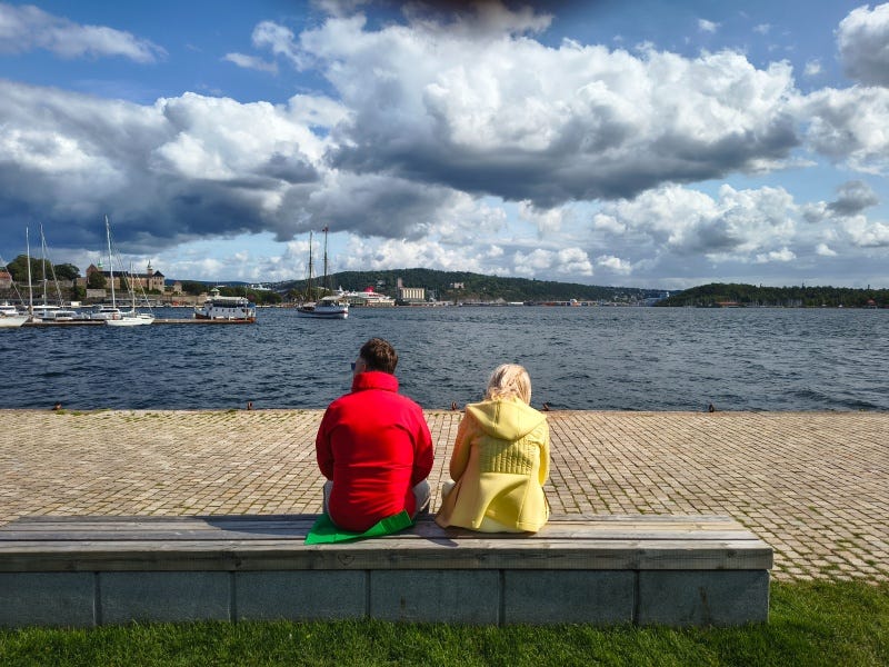 Mi chiedo se è qui in vacanza o se Oslo è la sua città. E penso che è un lusso poterlo fare ogni volta che sei triste, vuoi staccare la spina, o solo divertirti.