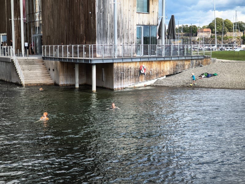 In una mattina incerta tra luce e nuvole, una famiglia scende sulla spiaggetta sotto l’Astrup Fearnley Museum Of Modern Art, quello progettato da Renzo Piano, parcheggiano il passeggino e fanno un bagno.