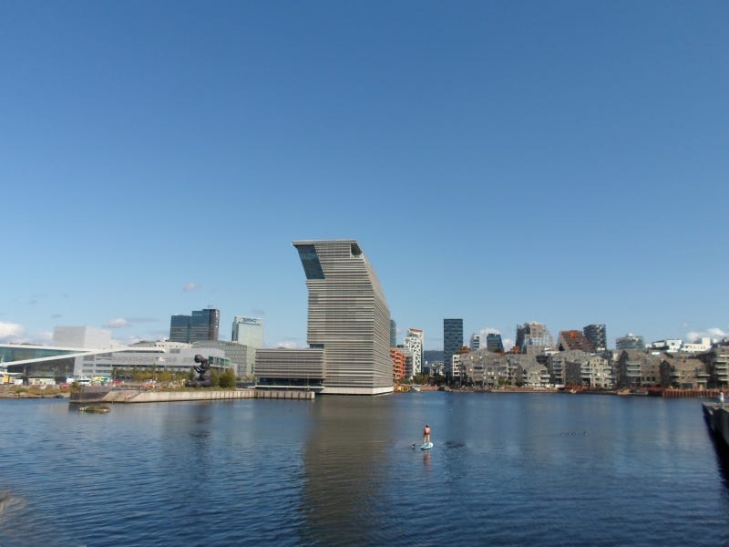La vedo passare lenta sotto i piedi e superare il ponticello dove sono affacciato: sulla tavola che scivola sull’acqua ci sono due gambe ben bilanciate e due braccia con una pagaia; quel corpo saldo punta verso l’Opera house e il Museo Munch.