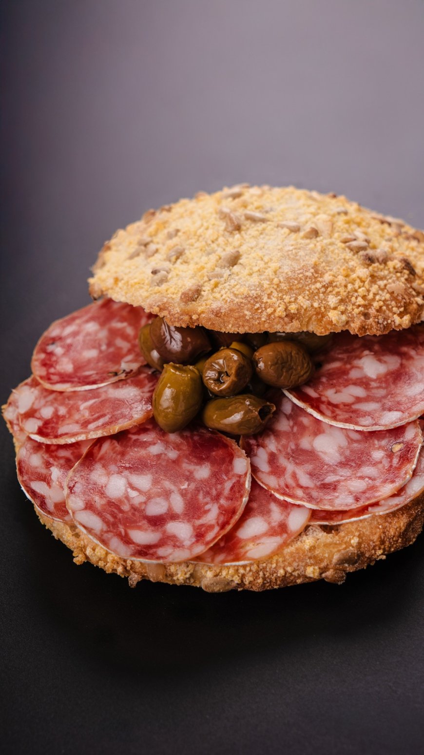Segue la focaccina croccante ai semi di girasole e mais con salame di Varzi e olive taggiasche, un incontro tra rusticità e morbidezza, reso speciale dal profumo intenso del salame di Varzi, dalla sapidità elegante delle olive taggiasche e dalla nota dolce dei fichi.