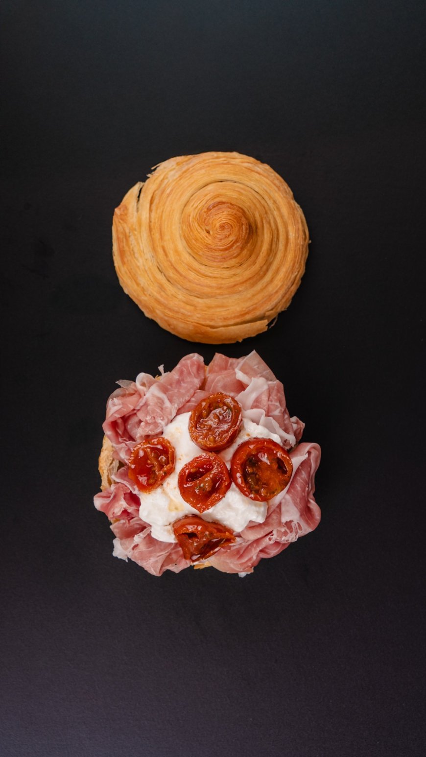 Chiudono la selezione i panini sfogliati con prosciutto crudo, burrata e pomodorini confit, in cui la sfoglia fragrante accoglie la cremosità della burrata e la dolcezza dei pomodorini, bilanciati dal gusto sapido del prosciutto crudo e dalla nota armoniosa della mela cotta al forno.