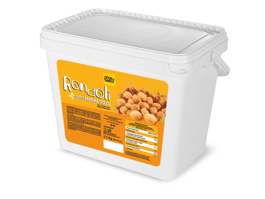 Il gusto Paprika Dolce unisce fragranza e carattere: la paprika dal profilo dolce e sottilmente affumicato conferisce ai Rondolì una connotazione calda e distintiva. Si prestano all’accompagnamento con preparazioni cremose, affettati o come proposta originale da condividere in compagnia. Disponibile in secchiello da 2,5 kg.