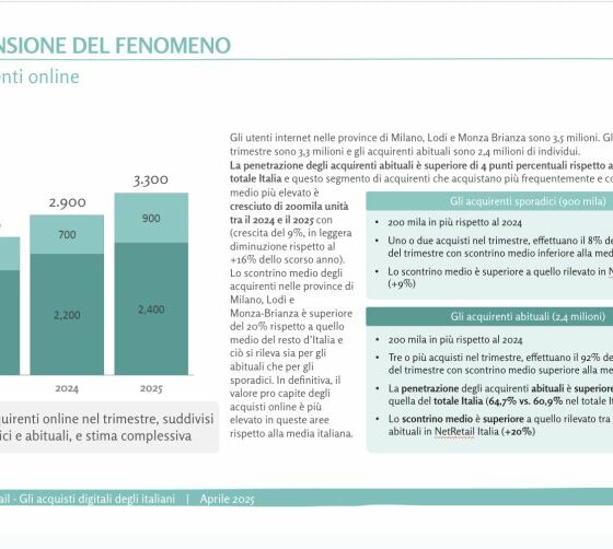 INDAGINI E RICERCHE – L’e-commerce italiano continua la sua crescita inarrestabile, come dimostrano i dati presentati durante l’ultima edizione del Netcomm Forum. La ricerca “Netcomm NetRetail 2025”, giunta al suo…